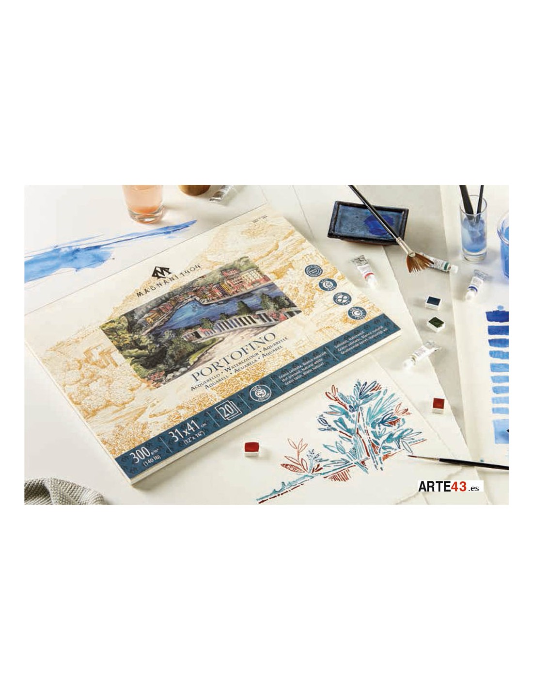 El papel Portofino tiene una superficie de grano satinado y es especialmente adecuado para todas las técnicas húmedas: acuarela, gouache, tinta y acrílico.