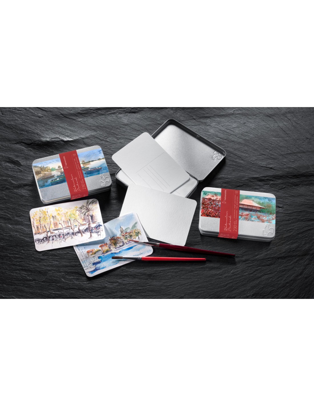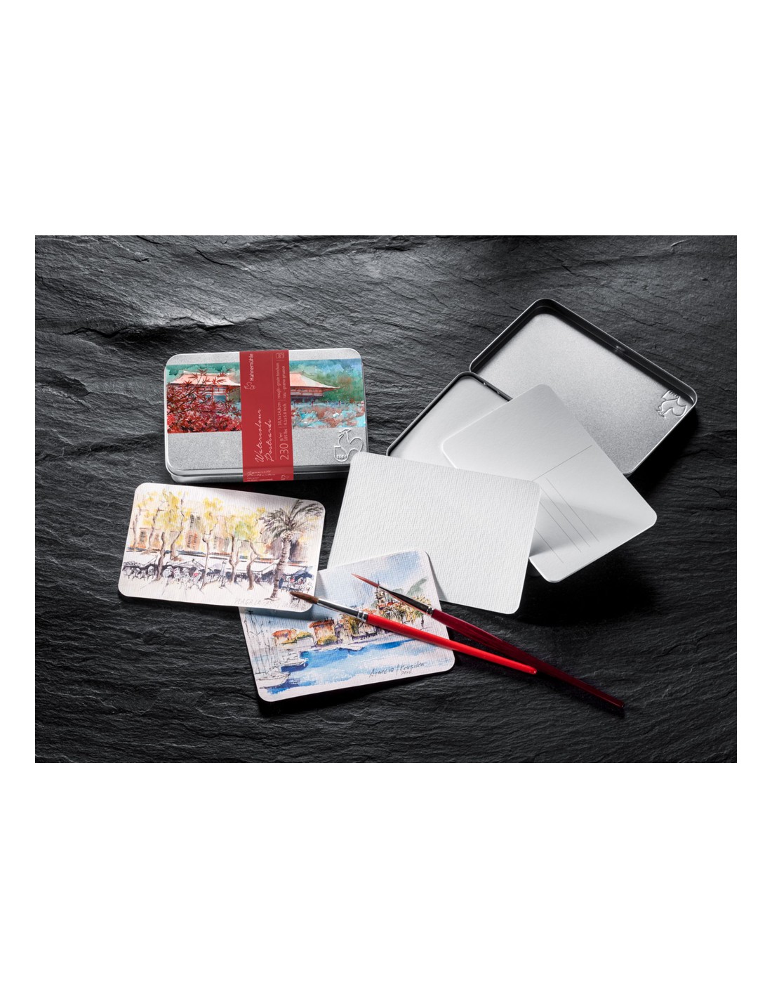 Los pintores de acuarela creativos encontrarán 30 postales sin blanquear, sin ácido y de la más alta calidad de archivo en esta atractiva caja de metal que presenta la imagen de las nuevas ediciones.