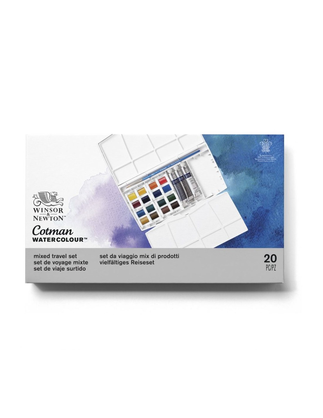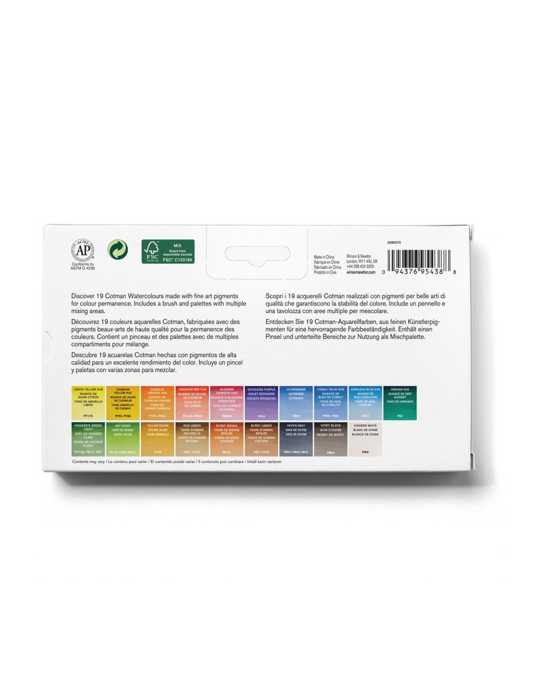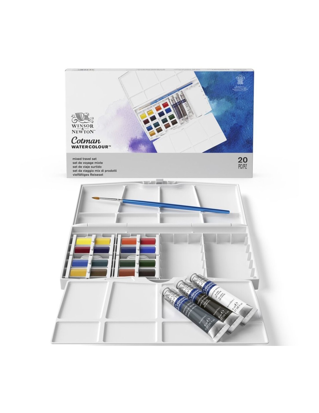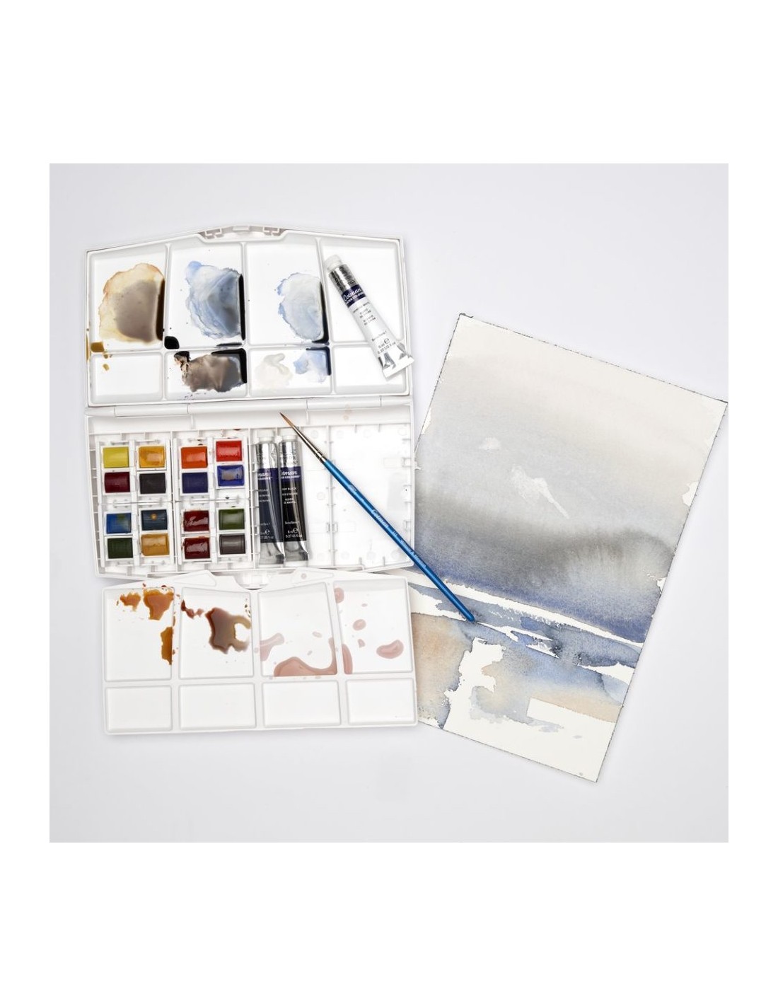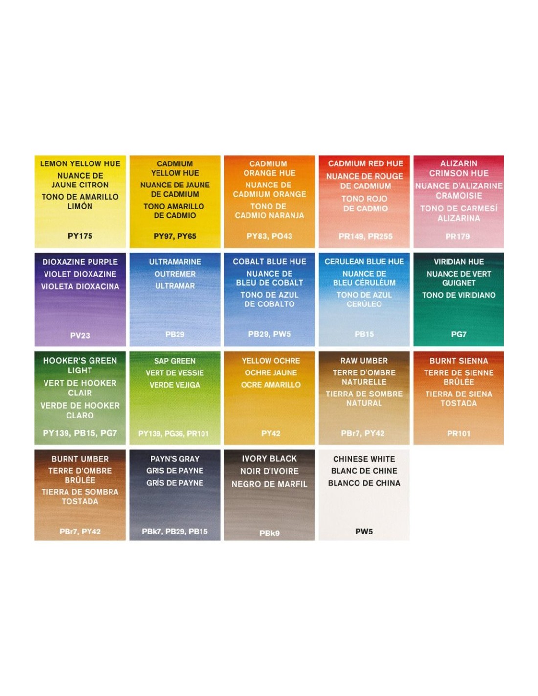 1 x Cotman round watercolour brush • 3 x Cotman 8ml tubes: Payne's Gray • Ivory Black • Chinese White • 16 x Cotman half pans: Lemon Yellow Hue • Cadmium Yellow Hue • Cadmium Orange Hue • Cadmium Red Hue • Alizarin Crimson Hue • Dioxazine Purple • Ultramarine • Cobalt Blue Hue • Cerulean Blue Hue • Viridian Hue • Hooker's Green Light • Sap Green • Yellow Ochre • Raw Umber • Burnt Sienna • Burnt Umber.