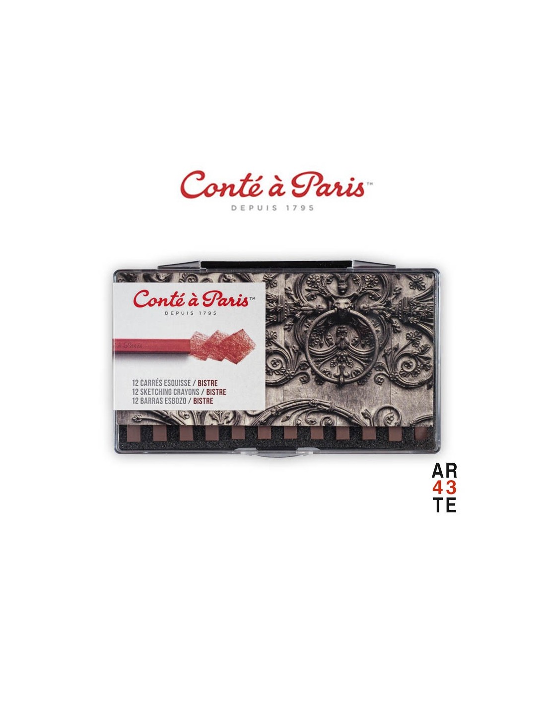 Las barras de esbozo Conté à Paris (Sketching) son muy suaves de aplicar y están hechos de pigmentos naturales (óxidos de hierro, negro de carbón, dióxido de titanio), arcilla (caolín) y un aglutinante (éter de celulosa).