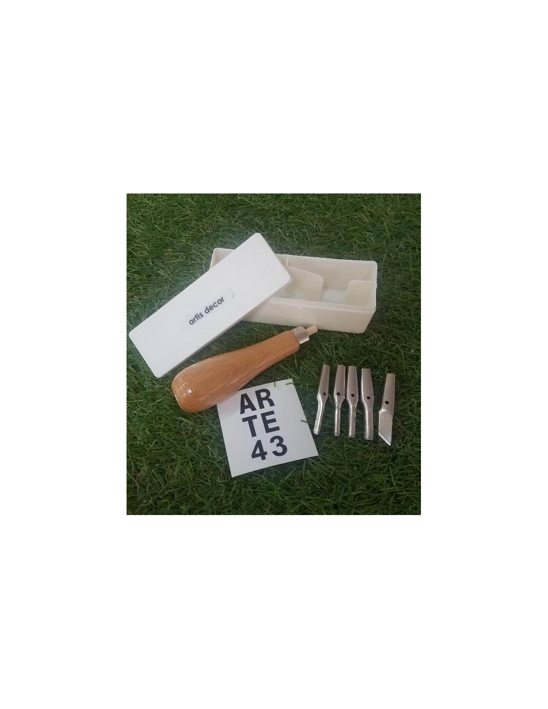 Set de 5 gubias para linóleo con mango de madera en estuche de plástico.