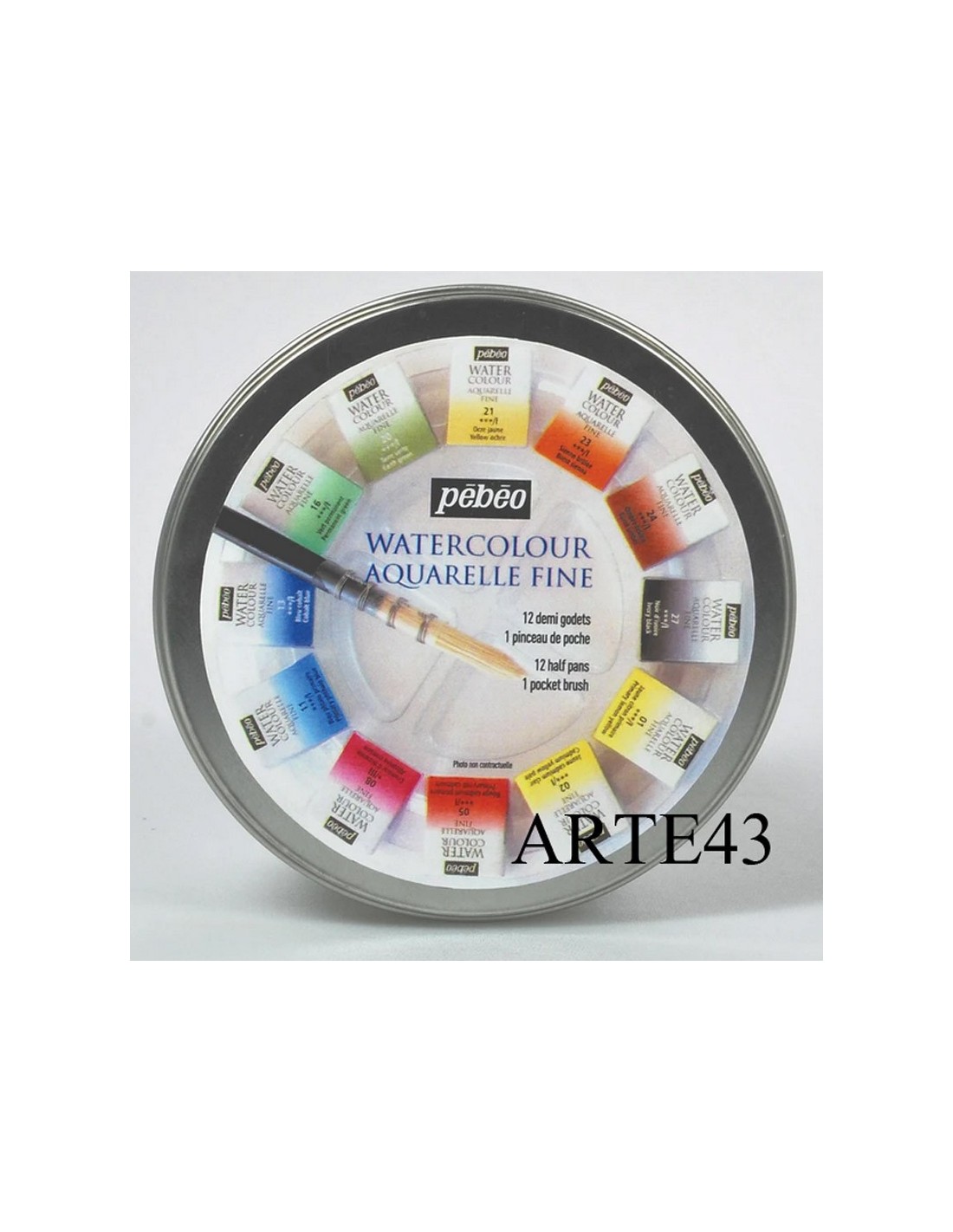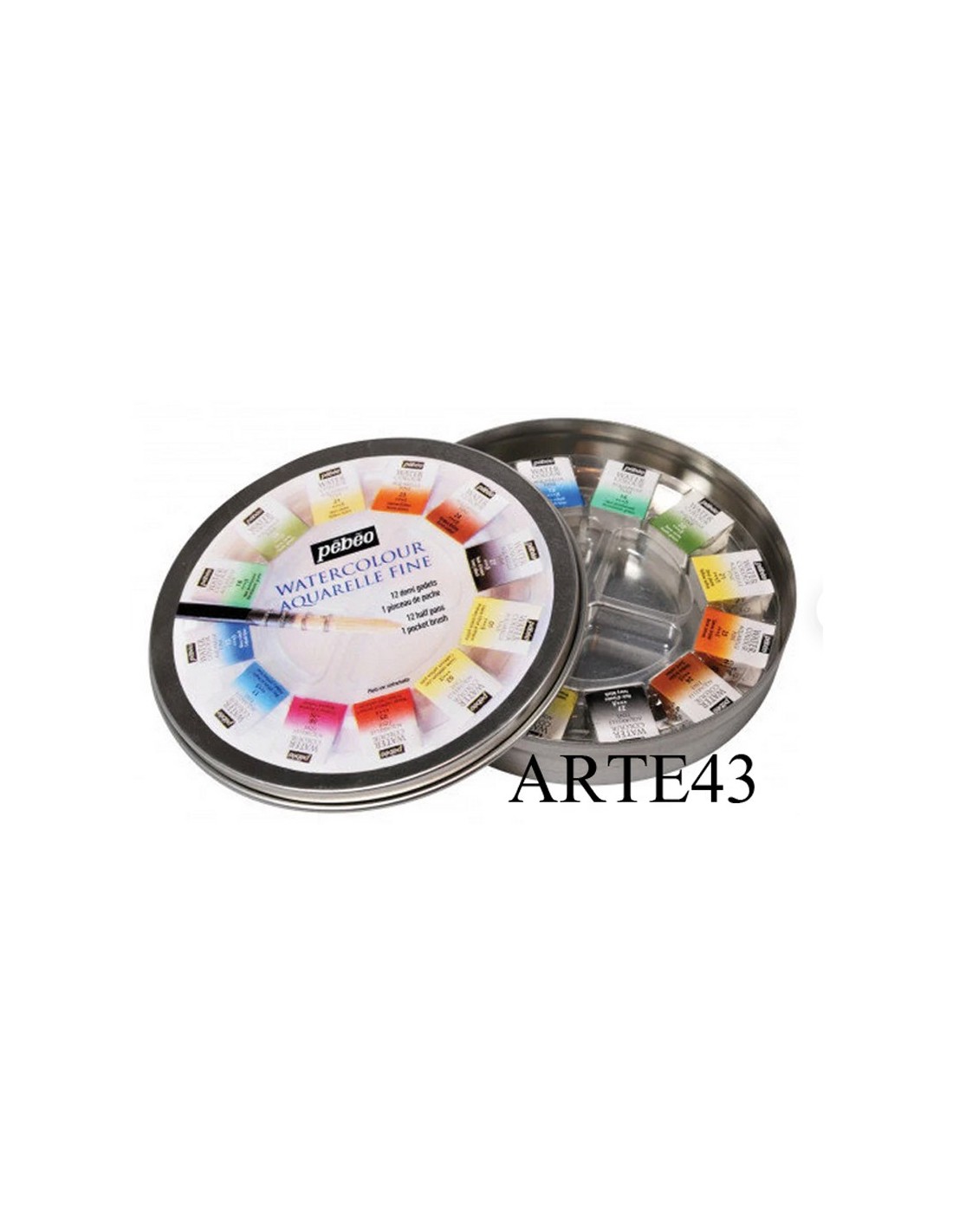 Caja metálica redonda con 12 medios godets de acuarela fina más pincel de viaje.