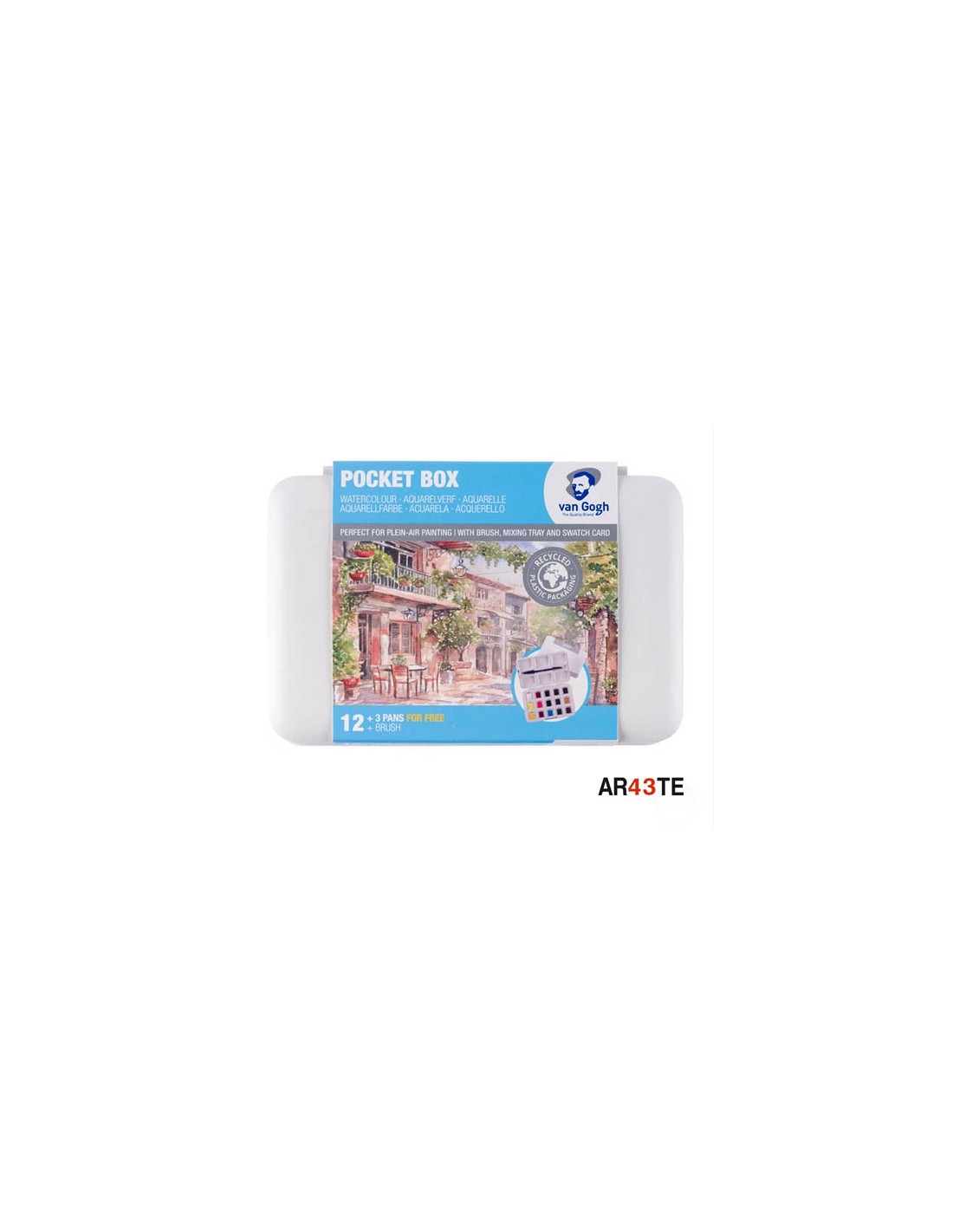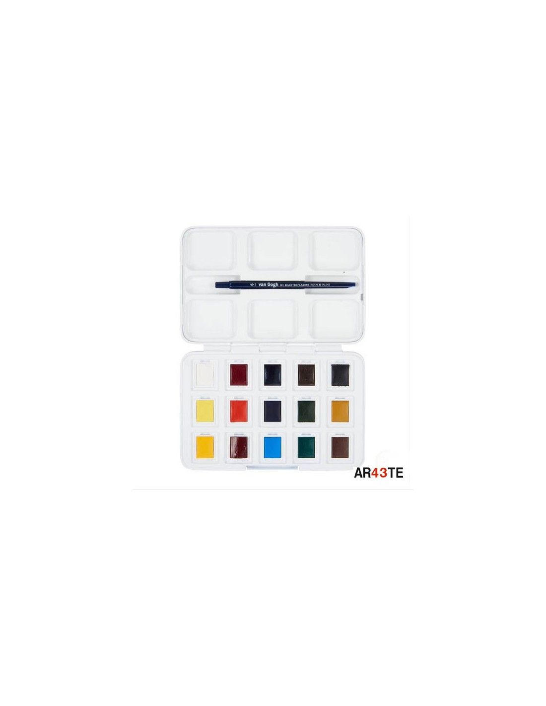 Estuche de plástico que incluye un pincel redondo de pelo sintético (tamaño 6) y una bandeja para mezclar.