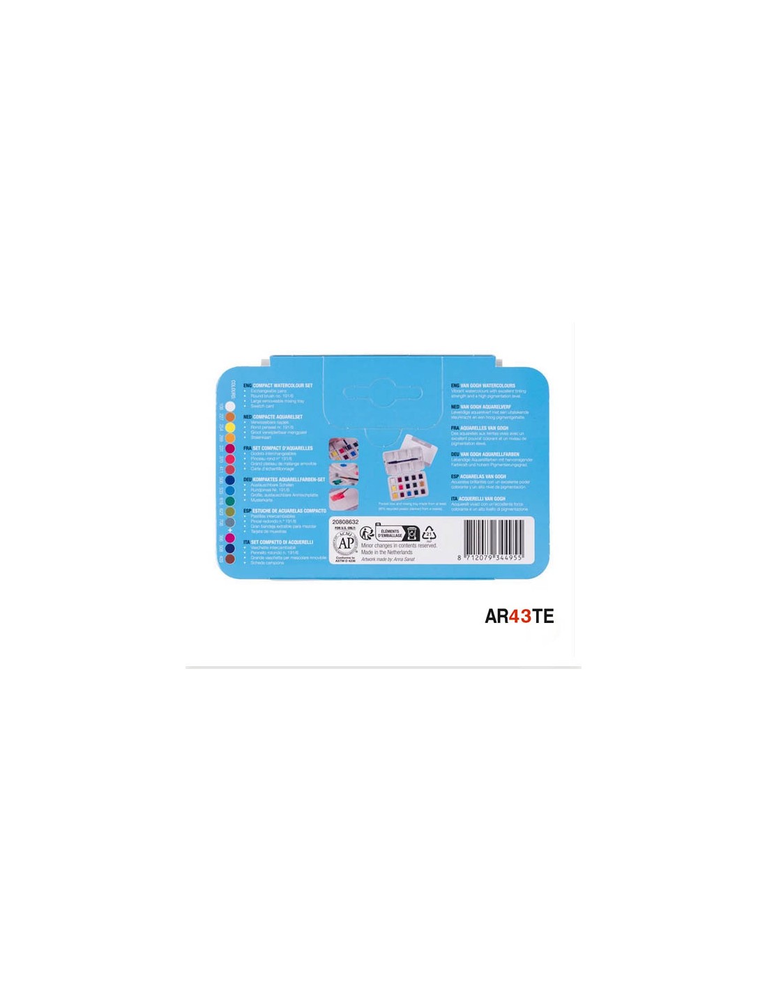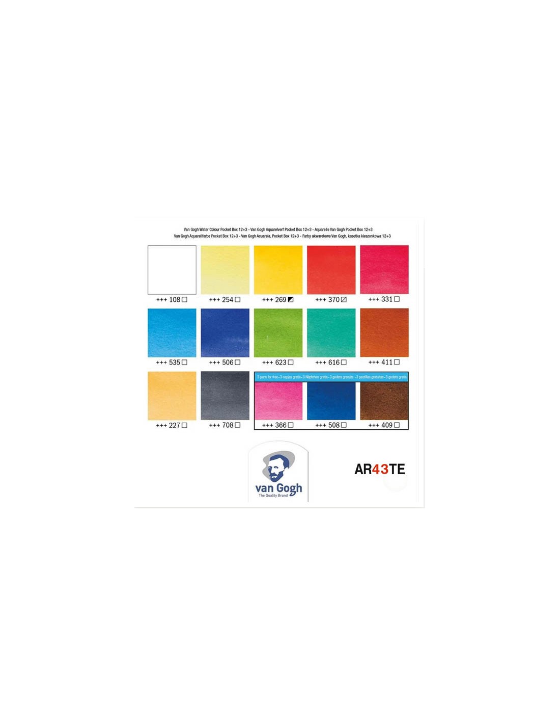 Blanco de China 108, Amarillo limón permanente 254, Amarillo azo medio 269, Rojo permanente claro 370, Laca granza oscuro 331, Azul ultramar oscuro 506, Azul cerúleo ftalo 535, Verde vejiga 623, Verde esmeralda 616, Tierra Siena tostado 411, Ocre amarillo 227, Gris Payne 708. Además, DE REGALO, incluye Rosa quinacridona 366, Azul de Prusia 508, Tierra sombra tostado 409.