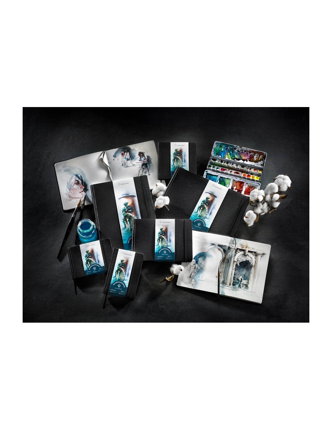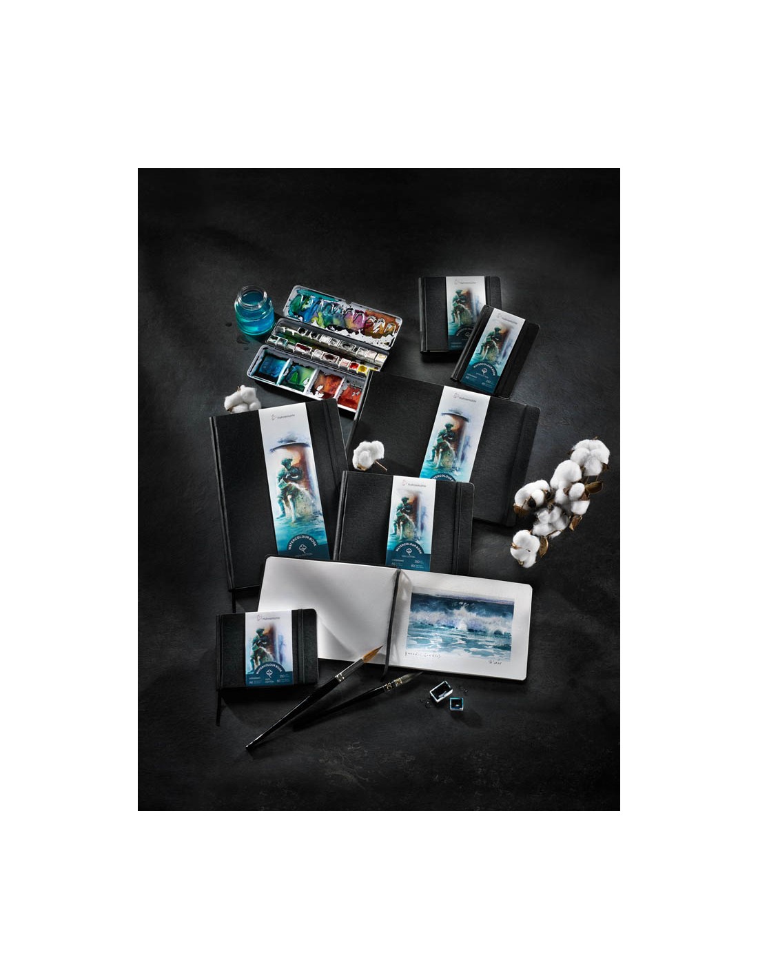 La cubierta negra, robusta, y un marcador de página negro confieren al cuaderno la elegancia y la estabilidad necesaria para convertirse en el compañero indispensable de todo acuarelista. Una banda elástica ayuda a cerrar el cuaderno con firmeza.