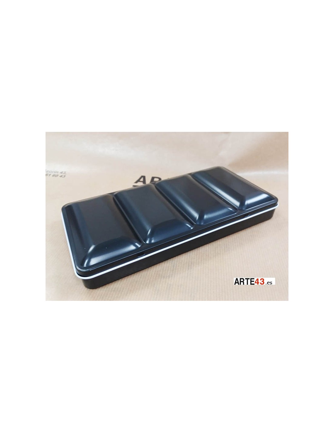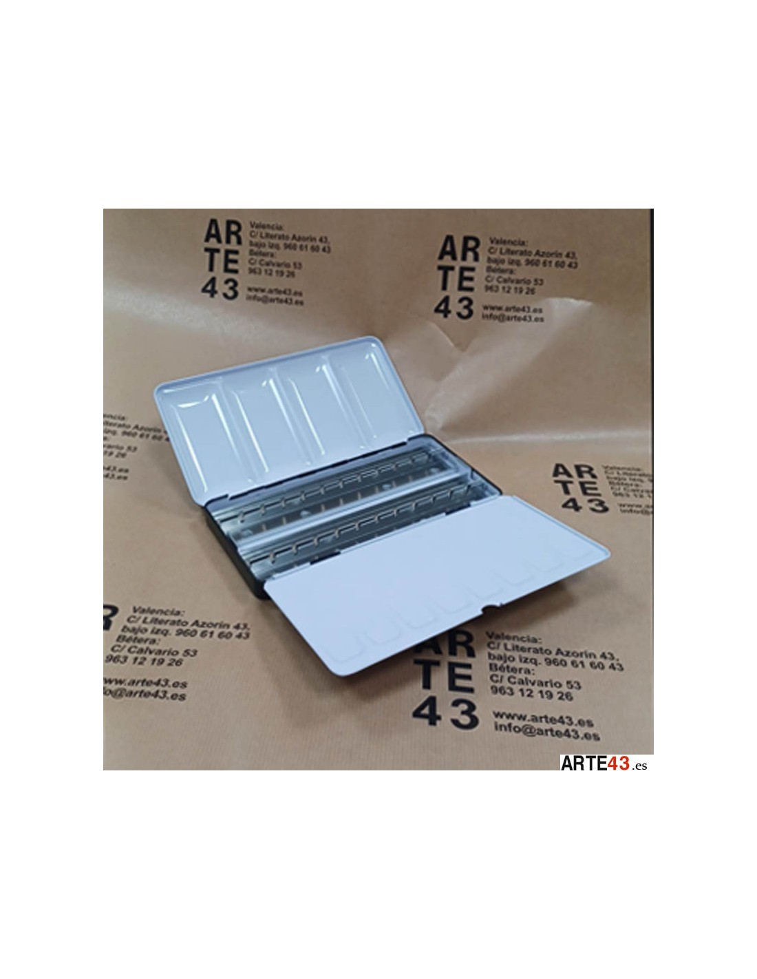 Estuche metálico vacío, para guardar tus 48 medios godets de acuarelas.