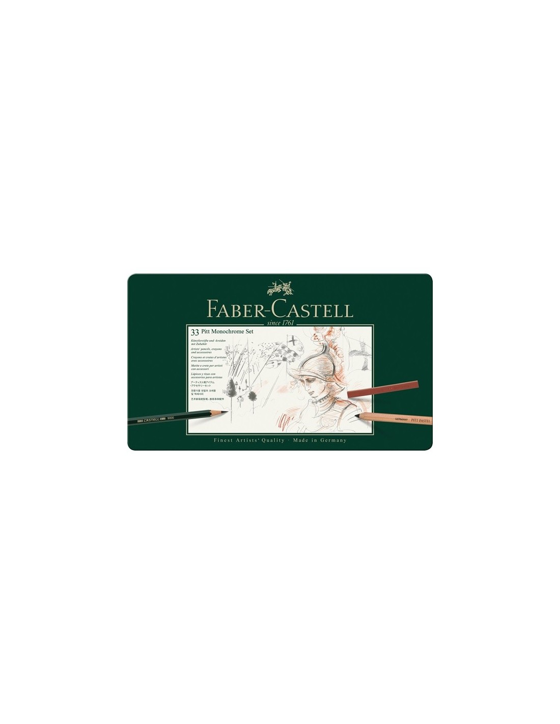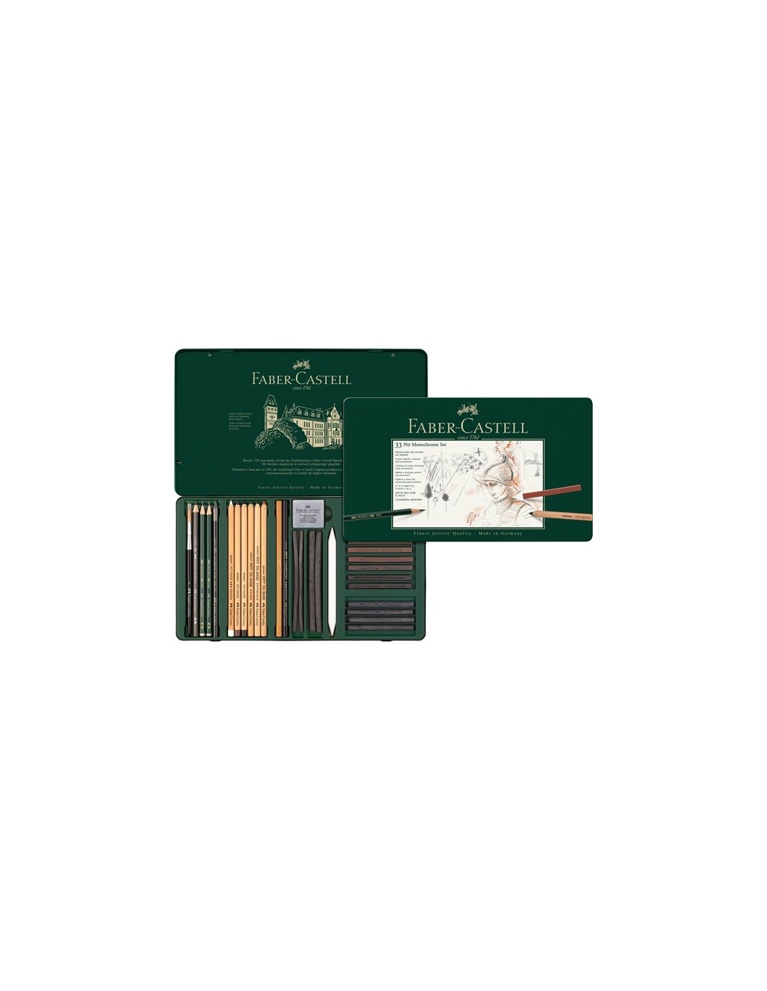 - el conjunto incluye: 2 lápices Castell 9000 2B, 6B,1 lápiz Graphite Aquarelle 6B, 1 lápiz Pitt Graphite Pure 6B, 3 lápices Pitt Oil Base, 3 lápices Pitt Pastel sin grasa, 10 Pasteles Pitt sin grasa, 4 Carboncillos Pitt prensados, 4 Carboncillos Pitt naturales, 1 lápiz Pitt de carbón natural, 1 lápiz Pitt de carbón prensado, 1 goma de borrar moldeable para arte, 1 limpiador de papel