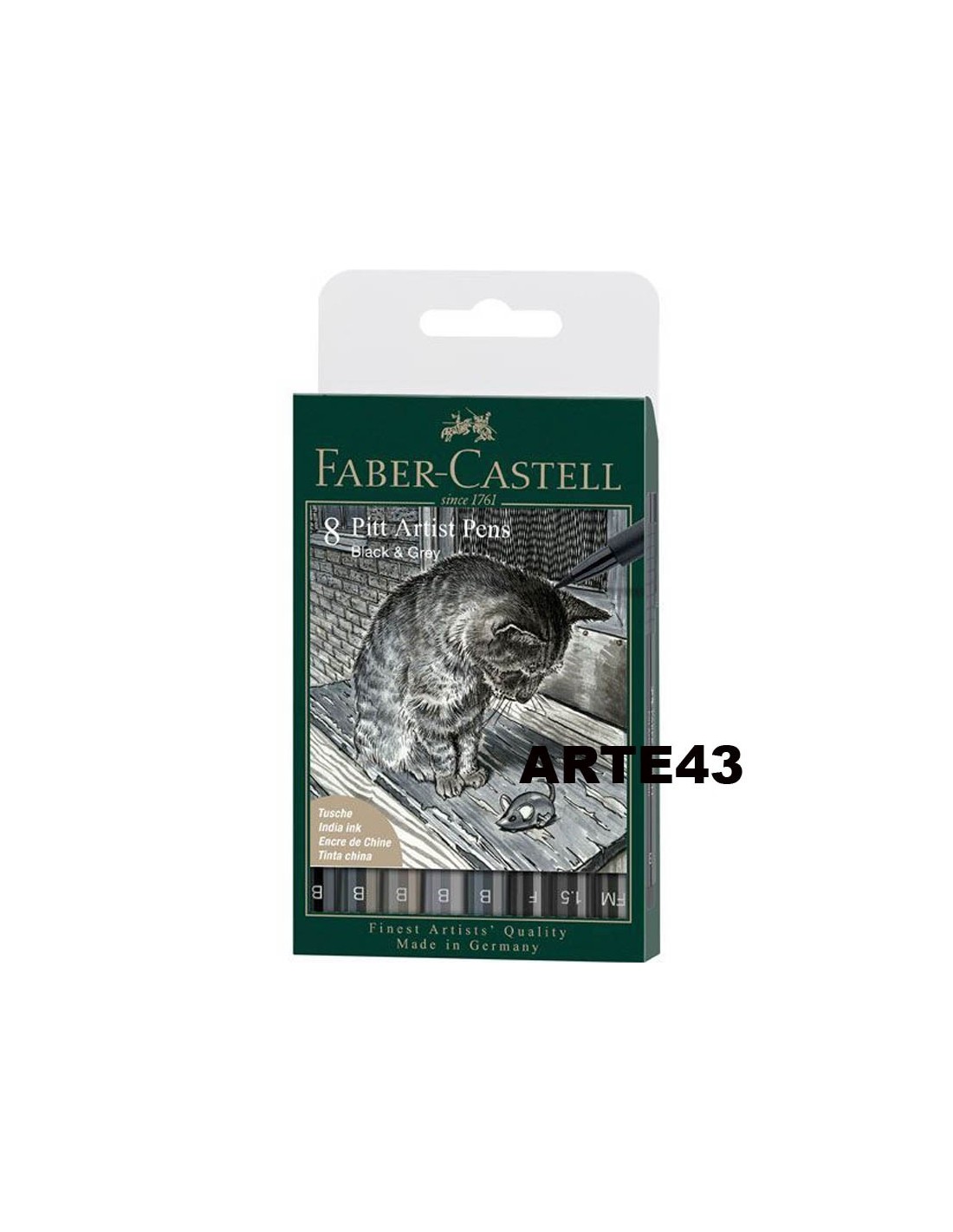 Set de 8 rotuladores Pitt de Faber-Castell, de tinta pigmentada, grises y negros. Tinta altamente resistente a la luz, resistente al agua y permanente. No desprende olores y está libre de ácidos. Ph neutro. Además, la tinta no traspasa el papel. Perfectos para la ilustracón, tanto de boceto como de obra acabada.